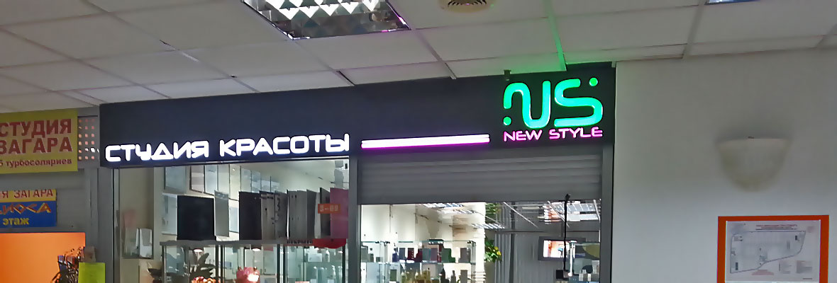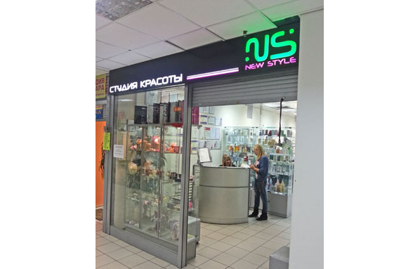 Для салона красоты «NEW STYLE» изготовлена и смонтирована вывеска - плоский световой короб со сменным изображением у эскалатора, ведущего к салону, а также световая вывеска над входом в салон, буклеты и особое фирменное мыло.