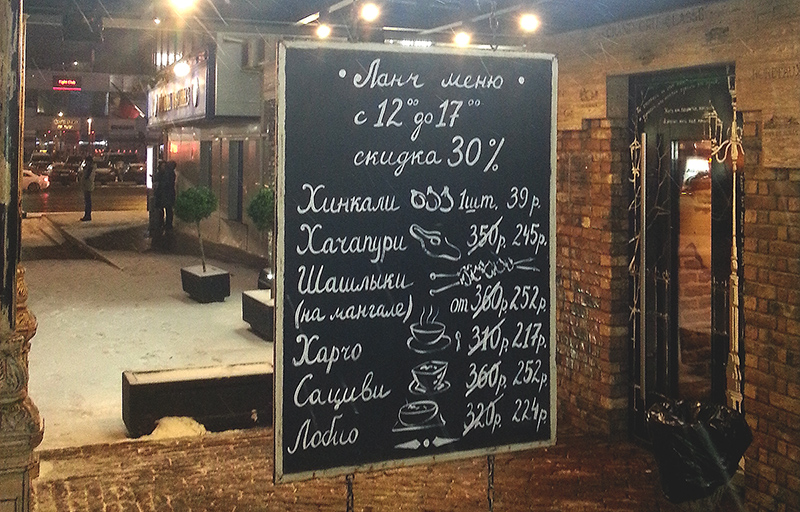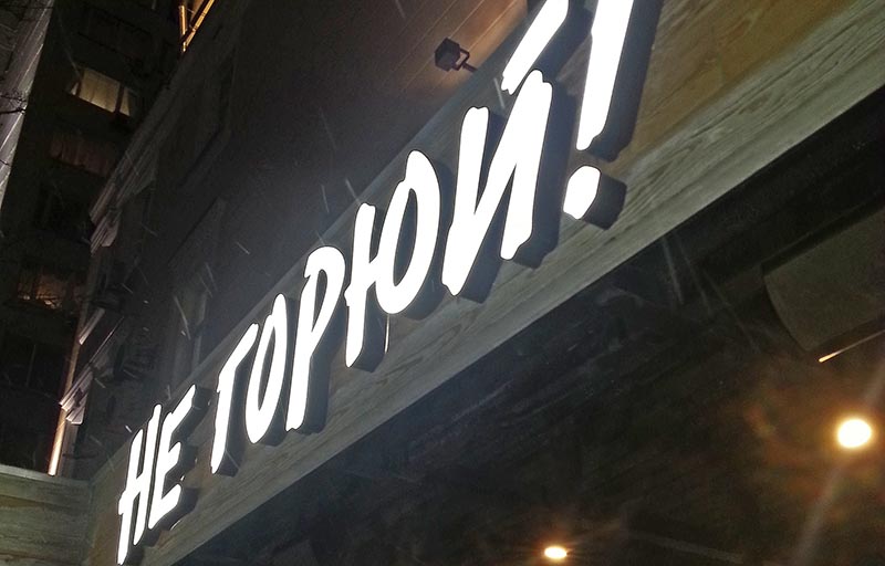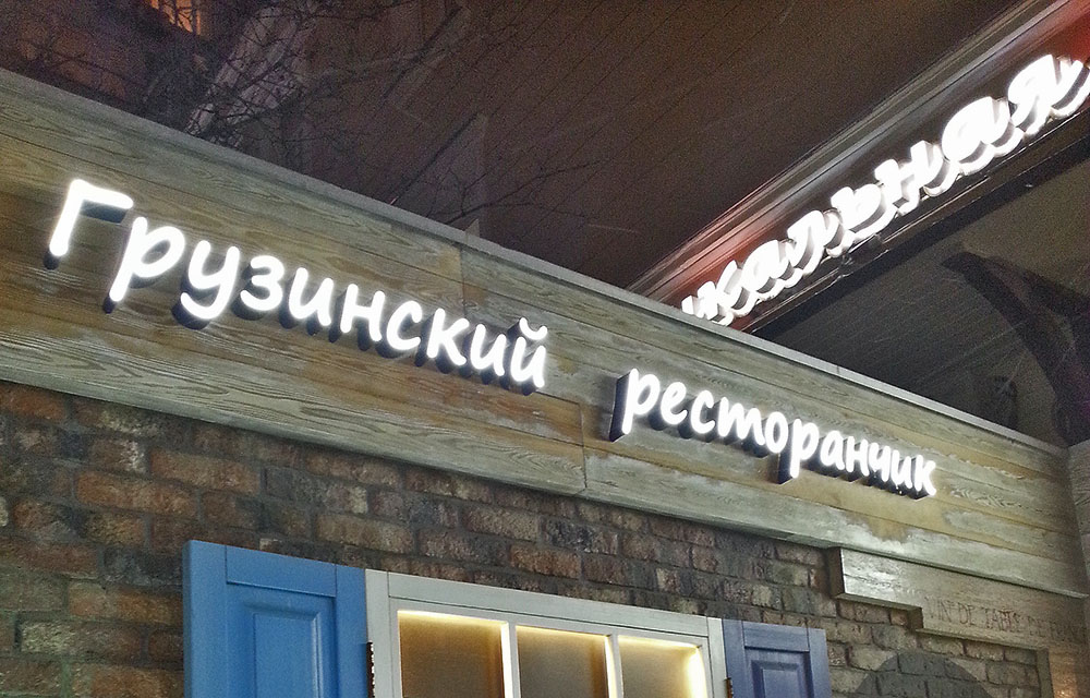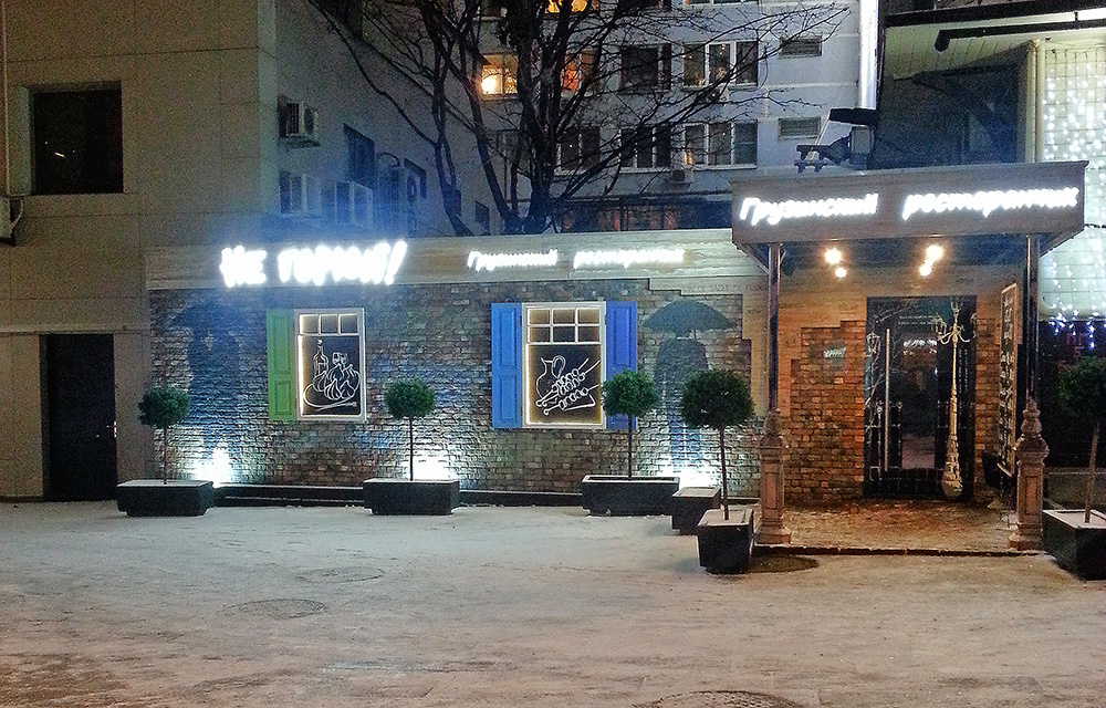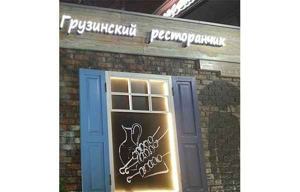 При разработке дизайна вывески над входом, необходимо было передать уют и домашнюю атмосферу ресторана с блюдами грузинской кухни. Фриз было решено изготовить из дерева и выкрасить в теплые цвета. Объемные световые буквы, изготовленные из акрилового стекла, ПВХ и светодиодов, закрепили на фриз. Проводку спрятали за заднюю часть фриза. Для подсветки вывески установили софиты. Окна оклеили пленкой с печатью. На наш взгляд получилось интересно!