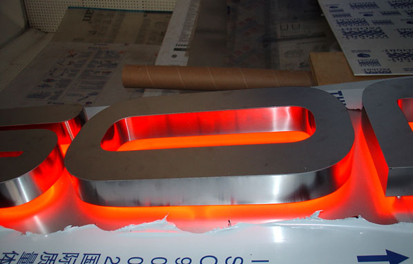 Подложка вывески изготовлена из композитного материала «Dubond», объемные световые буквы изготовлены из нержавеющей стали, смонтированы на дистанционных держателях. Подсветка неон, эффект свечения контражур.